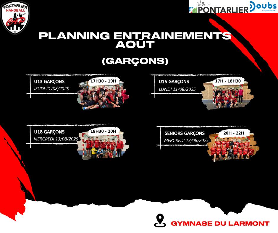 Entrainement Aout Reprise des entraînements ! Retrouvez les entraînements du mois d’août qui auront lieu au Gymnase du Larmont. Pour les U11G la reprise des entraînements aura lieu le mercredi 3 septembre de 16h30 à 18h au gymnase Léo Lagrange. Nos autres articles