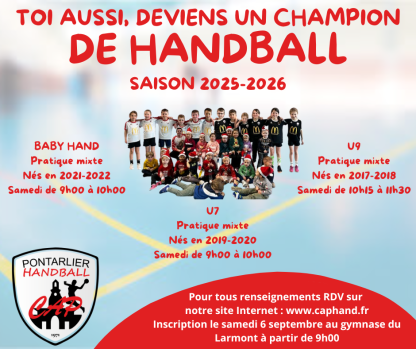 Inscriptions Baby Hand, U7, U9 Inscriptions 2025-2026 ! Les inscriptions pour les catégories Baby Hand, U7 et U9 mixte se dérouleront au gymnase du Larmont le samedi 6 septembre dès 9h. La reprise des entraînements aura lieu le samedi 13 septembre au gymnase du Larmont. Pour le Baby Hand, les places pour les nouveaux inscrits […]